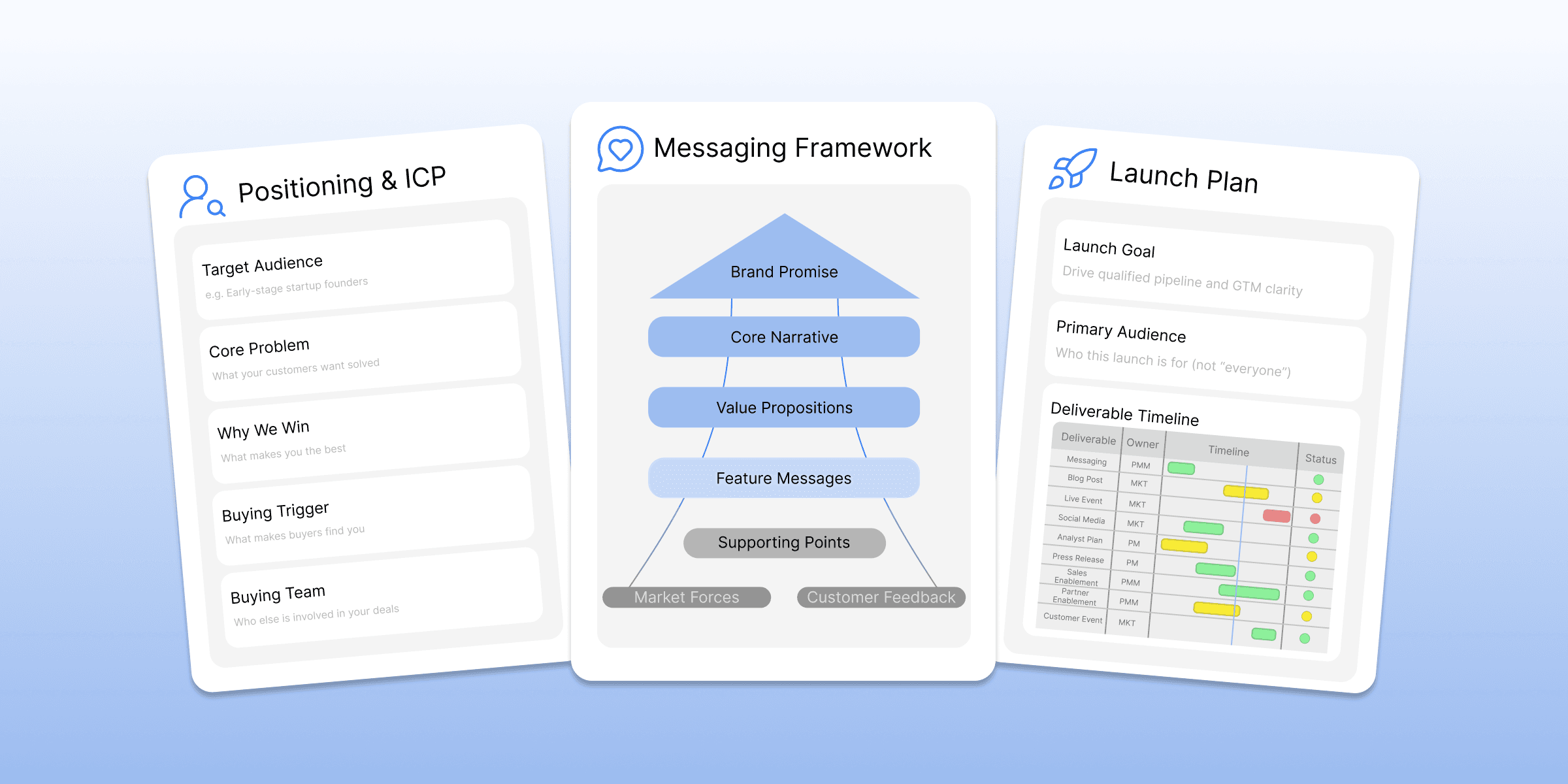 You’ll walk away with clear, usable deliverables, such as: Positioning & ICP strategy Messaging framework Launch plan with owners and timelines Core launch assets (as applicable) These aren’t slides that gather dust — they’re built to be used by your team.
